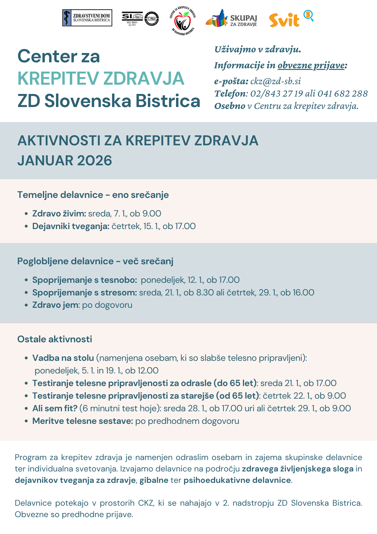 Spodaj najdete program za mesec januar 2026. Po predhodnem dogovoru smo na voljo tudi za pogovorne ure za krepitev zdravja, tako za odrasle kot tudi za otroke in mladostnike.